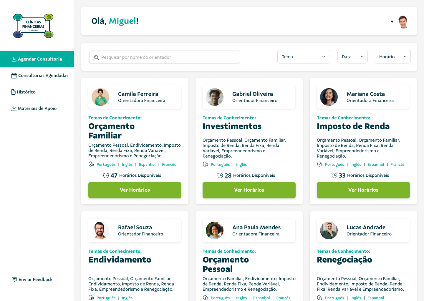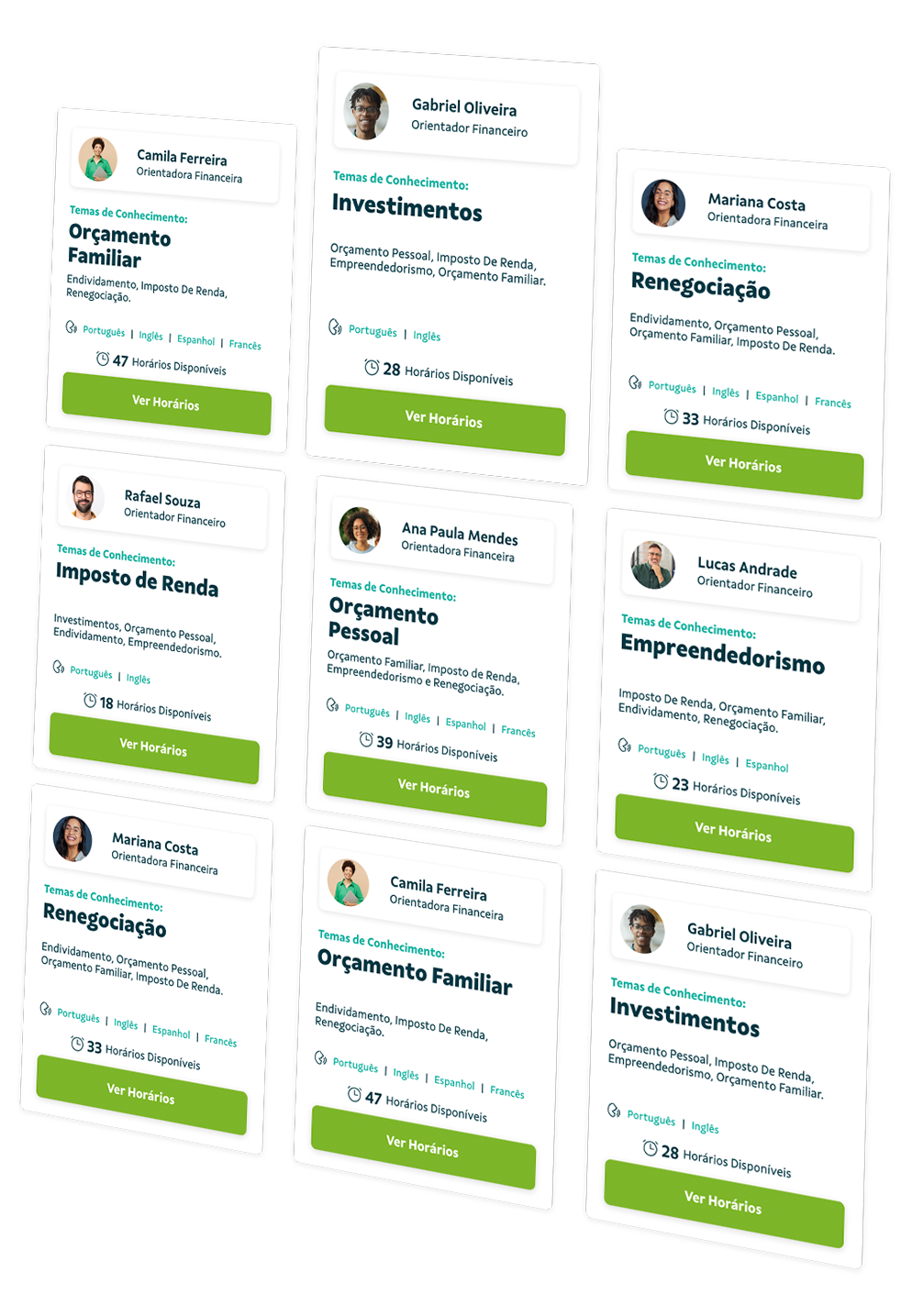 Na plataforma Clínicas Financeiras Virtuais, você encontra orientadores financeiros experientes e disponíveis para te ajudar com assuntos relacionados às finanças, por meio de consultorias individuais, de forma 100% online e gratuita.